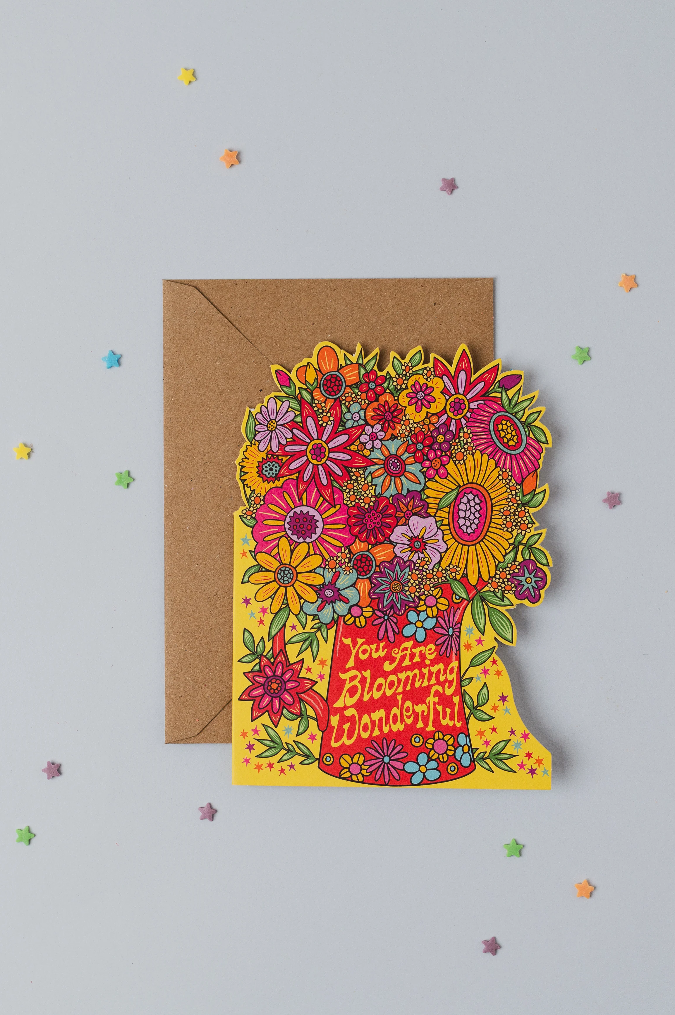 A vibrant celebration of all things wonderful. This is a new die-cut design from the Lost Plots collection, created in collaboration with artist Lisa Robson. Featuring a funky, colourful vase overflowing with bold, psychedelic flowers, this card radiates positivity and joy. The uplifting caption "You Are Blooming Wonderful" makes it perfect for any occasion - whether it's a birthday, congratulations, good luck, or just a cheerful hello.