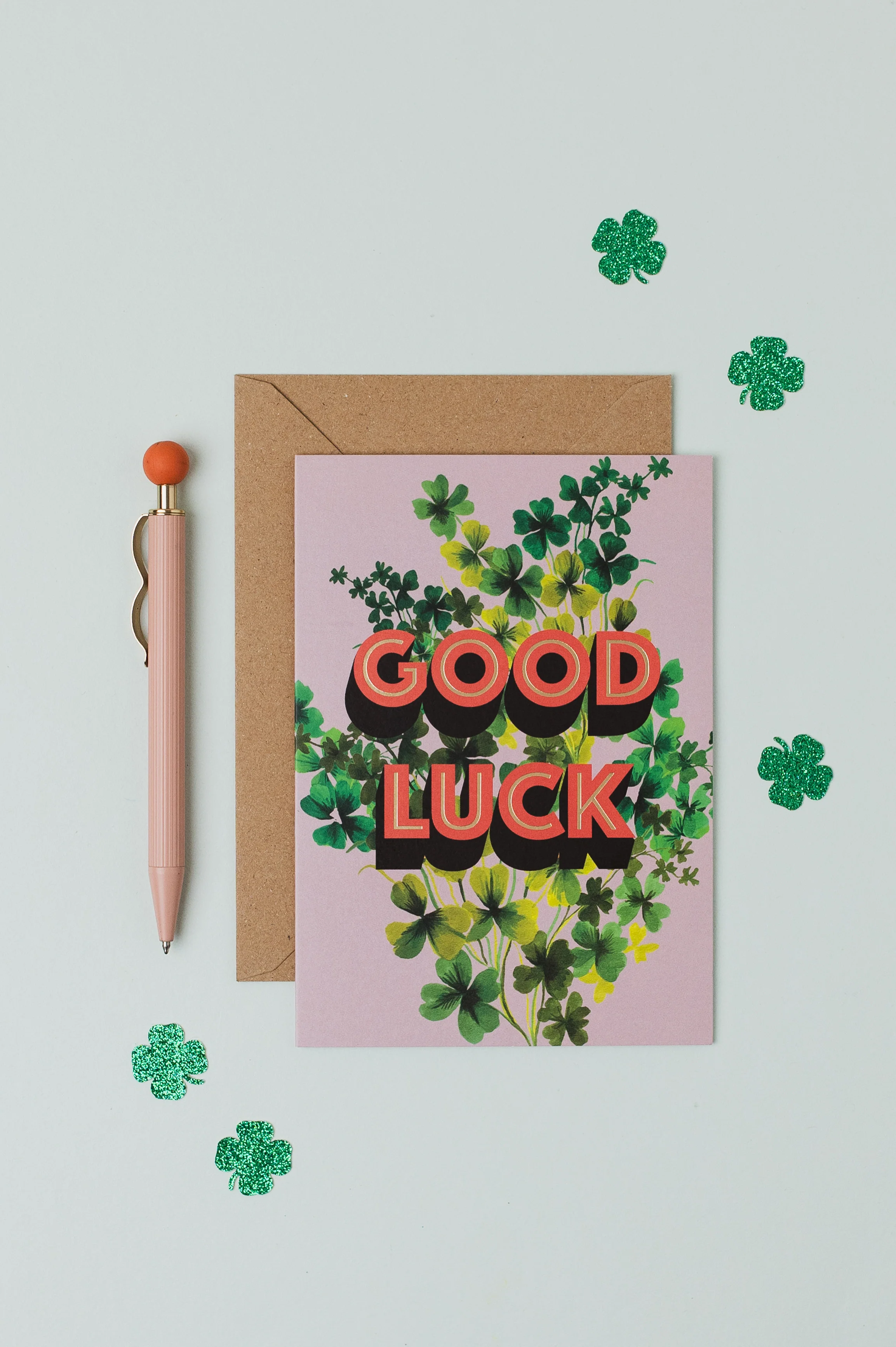 The uplifting design and bold “Good Luck” caption make this a bright and modern twist on a classic good luck card.